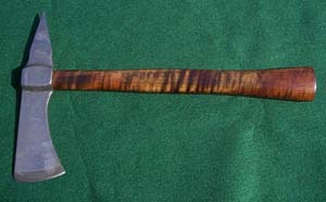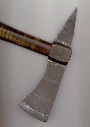 | Tomahawk Handle (haft): Curly Maple Oil Finished Blade: Nickel Damascus Blade Length: 5 1/2" Haft O/A: 14 1/2" AVAILABLE AT: MASTERSMITH www.BeautifulBlades.com |