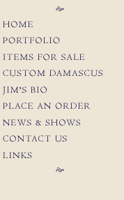 HOME ~ PORTFOLIO ~ ITEMS FOR SALE ~ CUSTOM DAMASCUS ~ JIM'S BIO ~ PLACE AN ORDER ~ NEWS & SHOWS ~ CONTACT US ~ LINKS